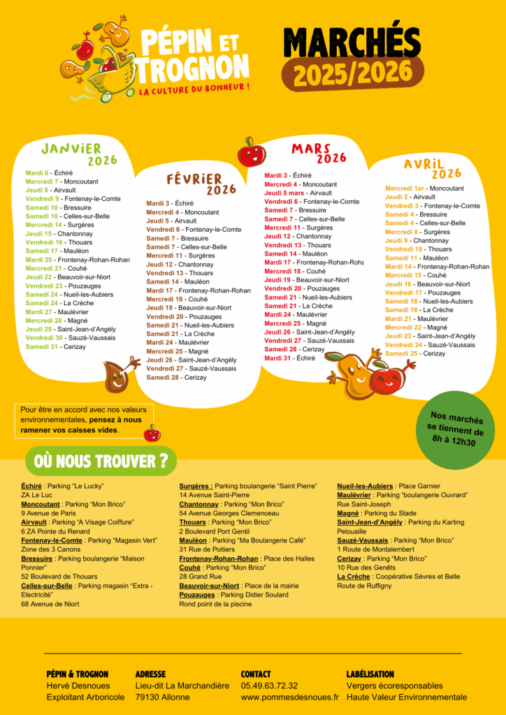 Le concept ? Une fois par mois, Hervé, le producteur & son équipe se déplacent dans chacune des villes présentes à droite, pour vous proposez des pommes et des poires en direct producteur. 5kgs ou 10 kgs c’est comme vous le souhaitez !